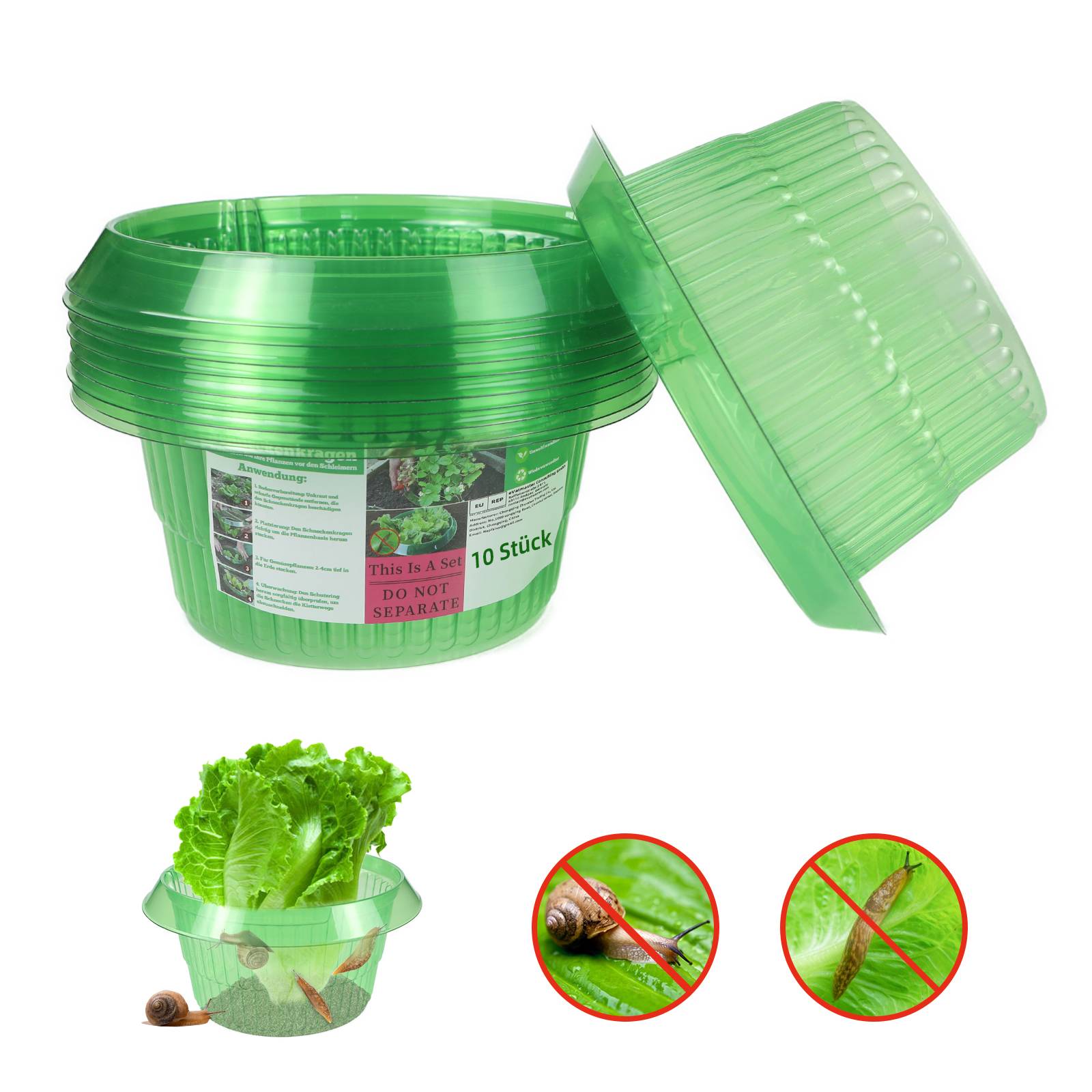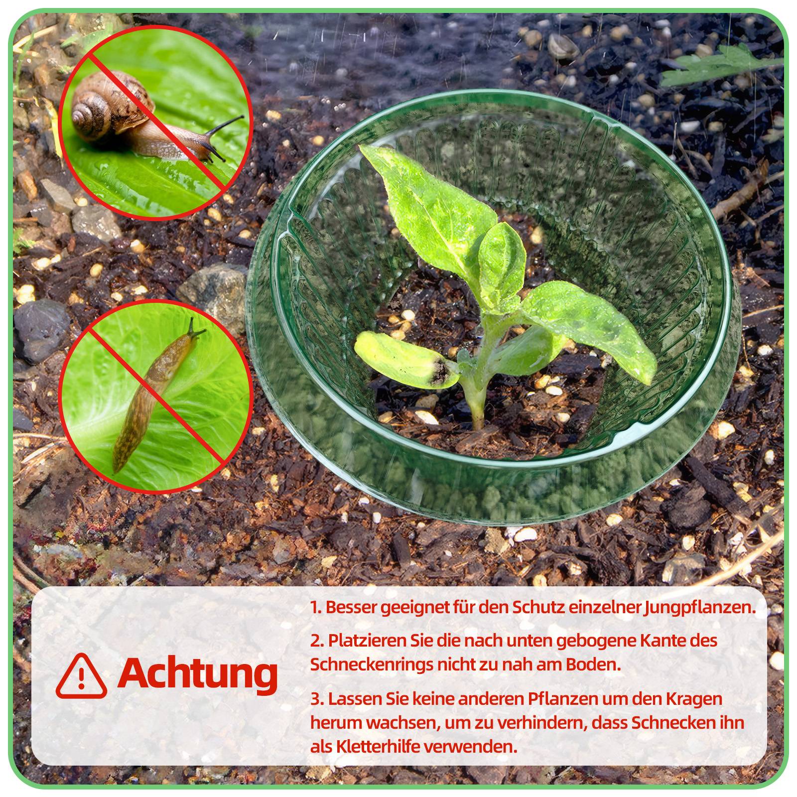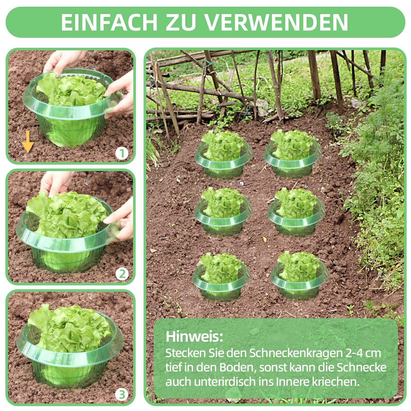 EINFACHE ANWENDUNG: Der Schneckenschutzring ist leicht zu verwenden, stülpsen Sie einfach den Salatring über die Pflanze, die Sie schützen möchten, und drücken Sie ihn 2-3 cm tief in die Erde. Es ist wichtig vor der Verwendung zu beachten, dass keine anderen Pflanzen über oder unter dem Ring wachsen, weil sich sonst die Schnecken auf die Pflanzen oder in den Ring abseilen.