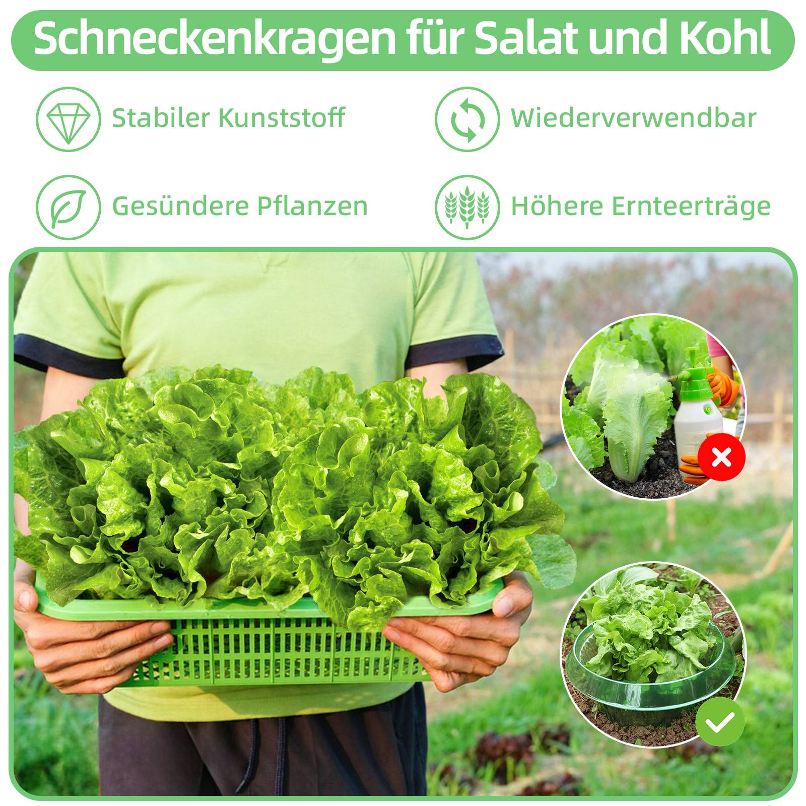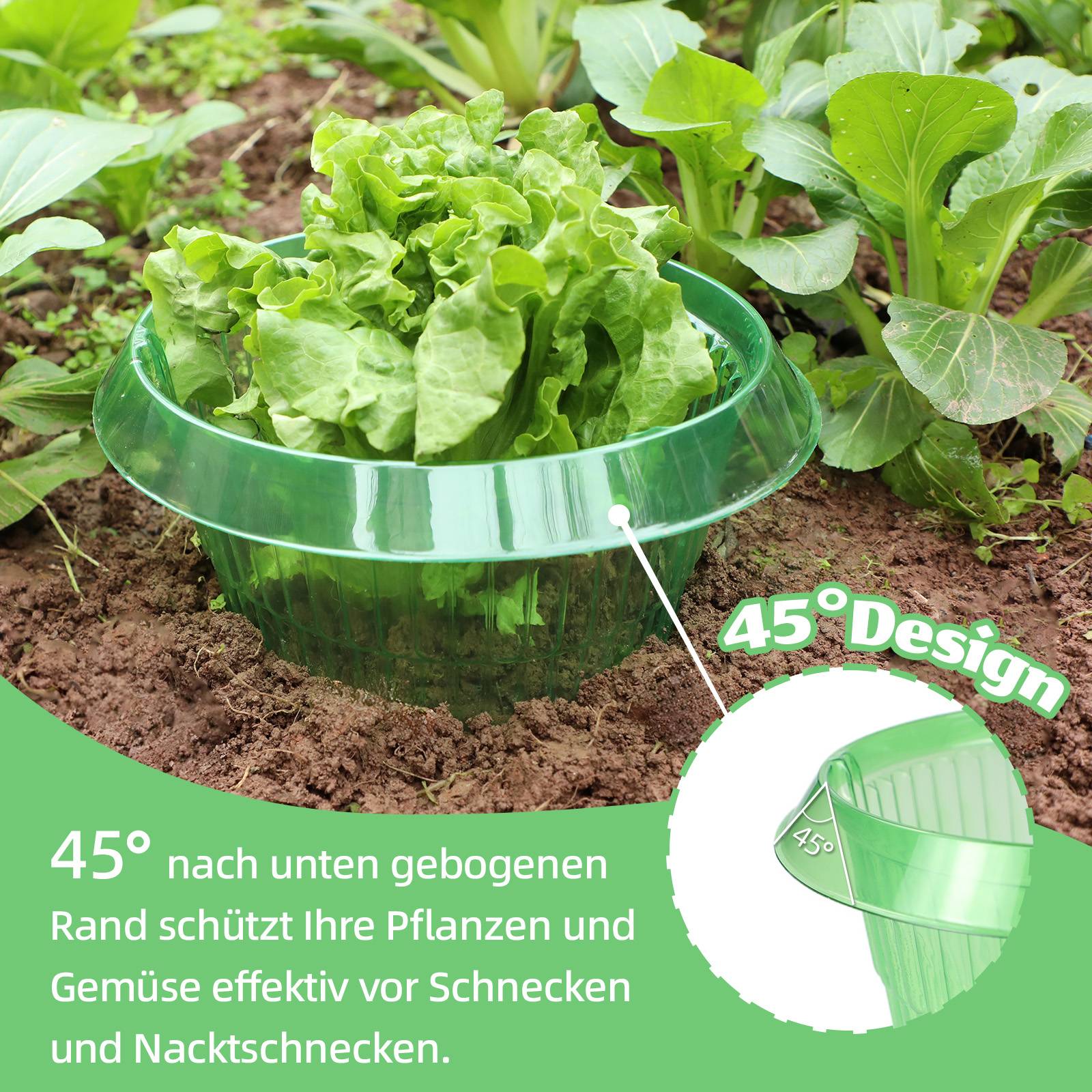 PRAKTISCHES DESIGN: Der Schneckenkragen für Salat verfügt über ein nach unten gebogenes 45°-Kantendesign, das eine unüberwindbare Barriere für Schnecken und Nacktschnecken darstellt. Neben der Schneckenbekämpfung sind Schneckenringe auch eine tolle Gießhilfe. So können Sie die Wurzeln Ihres Gemüses gezielt bewässern und Wasserverluste reduzieren.