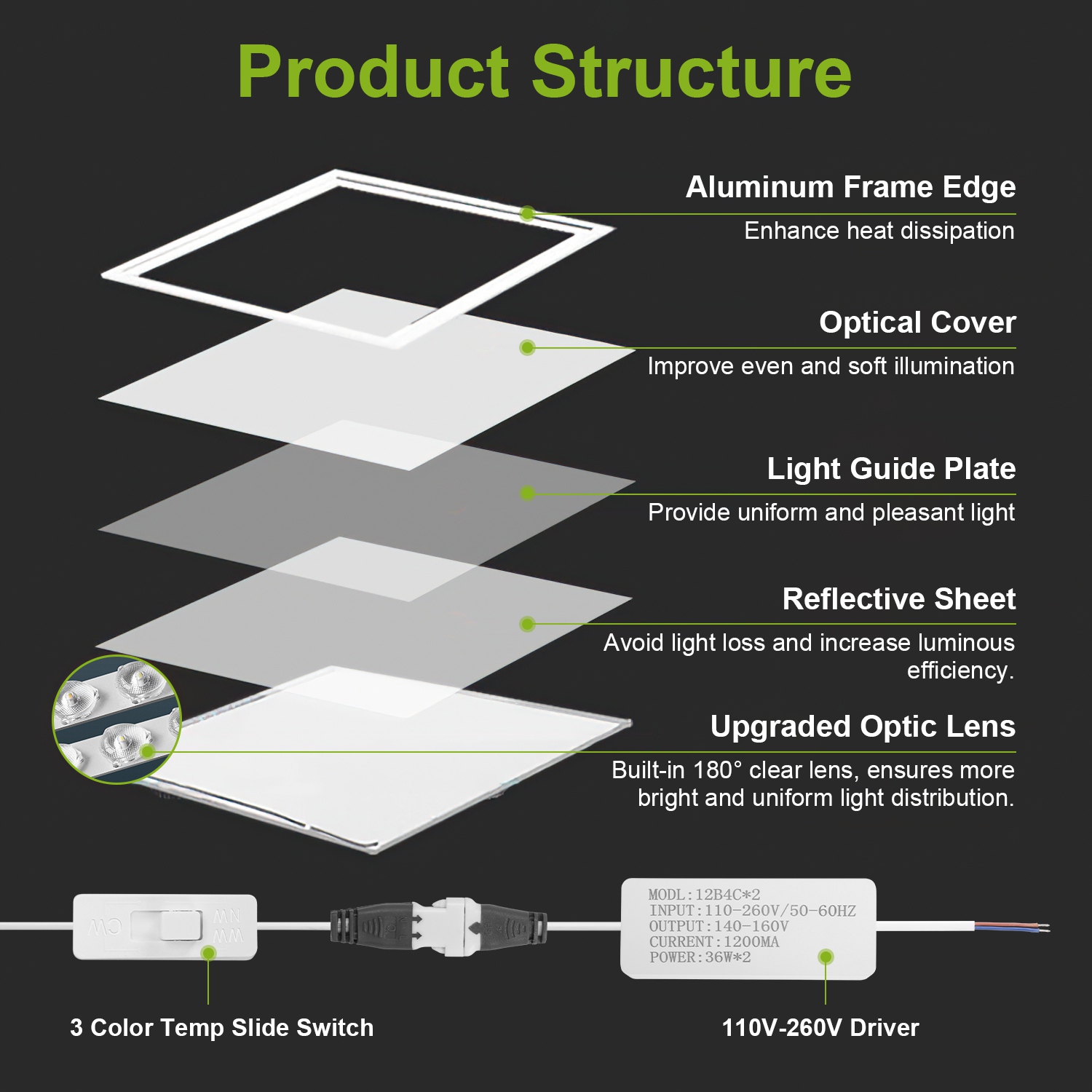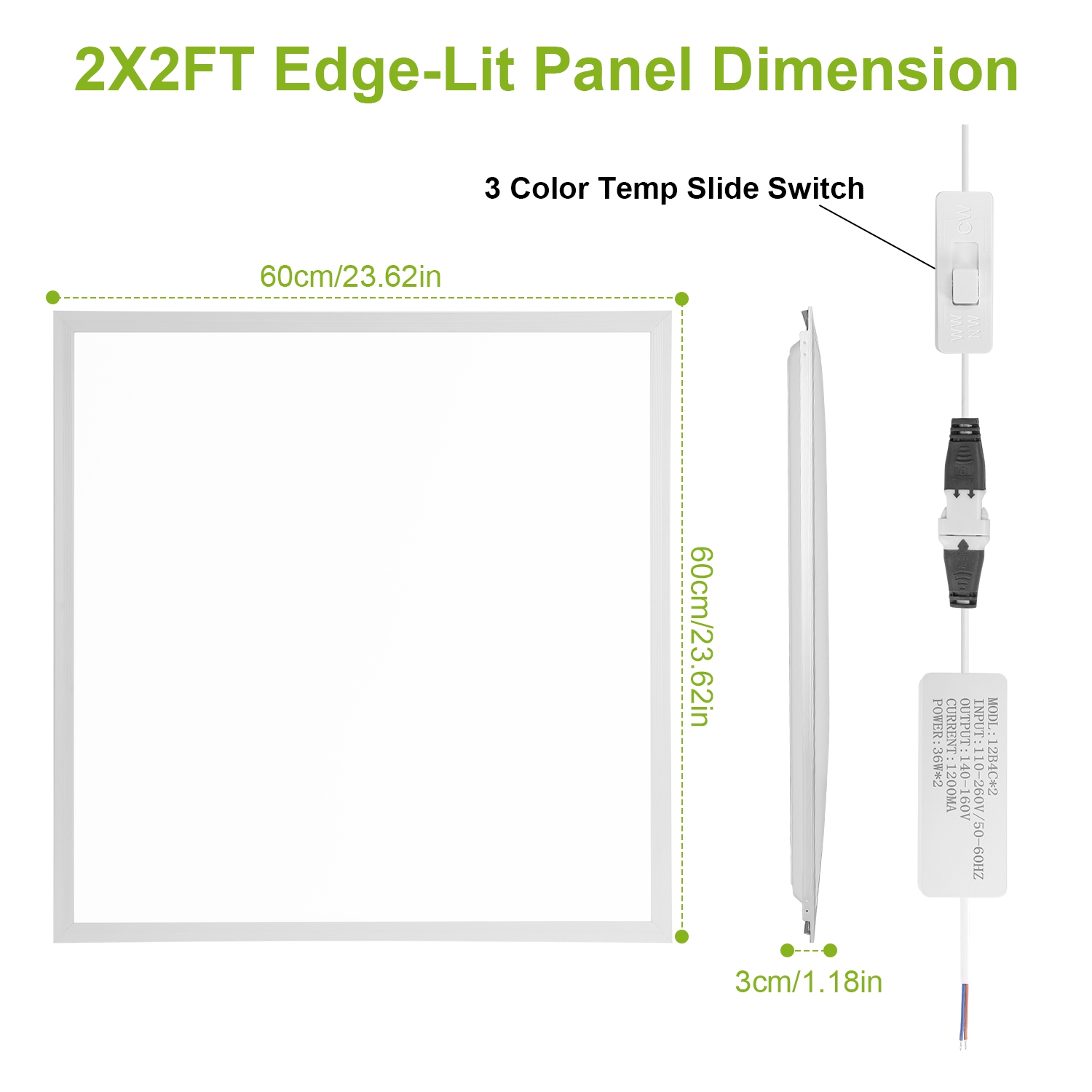 - *3 Color Temperature*:There is a color temperature slide switch on the cable between the driver and light of each 2x2ft LED flat panel light,choose 3000K/4000K/5000K(warm white/natural white/cool white) when installing. Besides,built-in 96Pcs SMD2835 LED beads,our panel light offers total 72W excellent lighting effect equivalent to 150W traditional fluorescent fixtures,saves up to 70% on electricity bill.