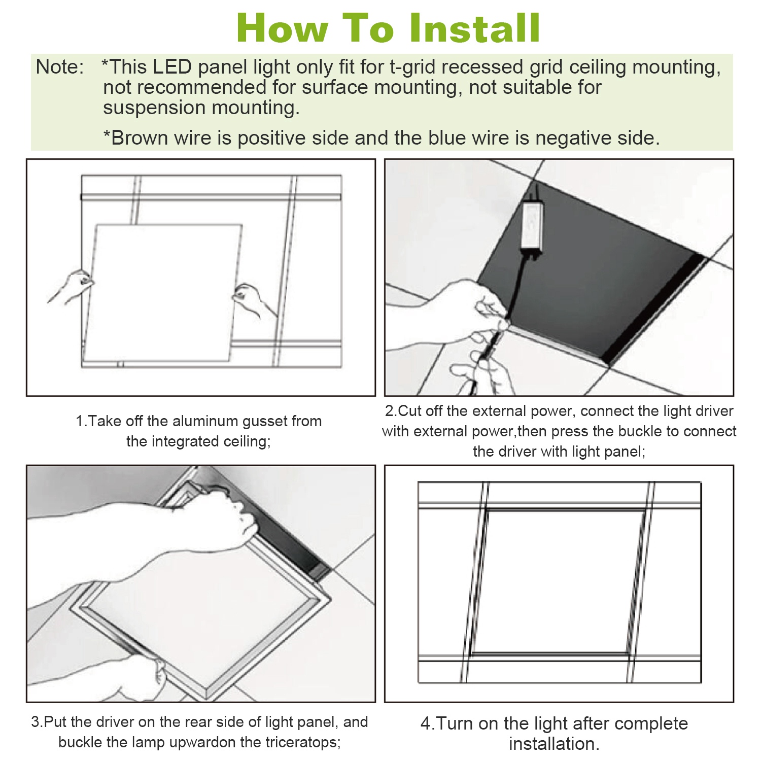 - *Easy Installation*:Standard size makes it an awesome replacement for a 2×2FT fluorescent troffer fixture,easy to install with included user instruction. Note:This LED panel light only fit for t-grid recessed grid ceiling mounting,not suitable for suspension or surface mounting.